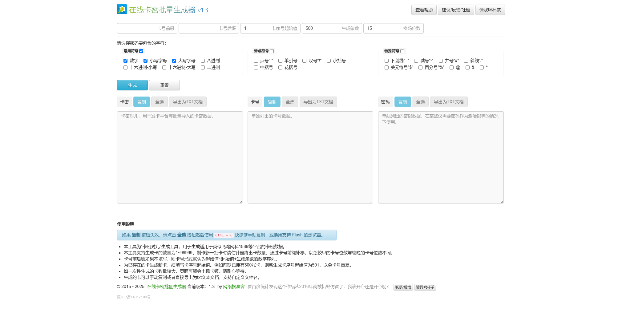 站点关键:卡号卡密,批量生成,卡号生成,密码生成,卡号密码生成,密码批量生成,卡号批量生成,密码导出,卡号导出,卡密生成,卡密在线生成器,在线卡密批量生成器,卡密一键生成,在线卡密生成工具,自动发货卡密生成,自动发卡平台卡密生成,在线卡密对批量生成,售卡平台伴侣,网络摆渡客,ferrinweb
