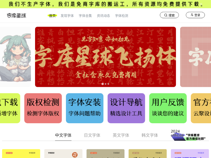 站点描述:字库星球是国内专业免费可商用字体收录平台,2023年创办至今,作为字体行业风向标,我们近年来专注于免费可商用字体的收录学习成长交流。 通过字库星球、字库字体检测、字库星球设计导航分别沉淀优质字体事业服务。是一家集齐媒体、内容、服务的多元化平台。MCN矩阵@字库星球 在微博、微信、小红书、抖音、B站布局,汇聚全网免费可商用字体,提供免费可商用免费字体下载。所有免费字体的授权均经核对确认,个人及商用均可免费自由使用,有效规避字体版权风险。