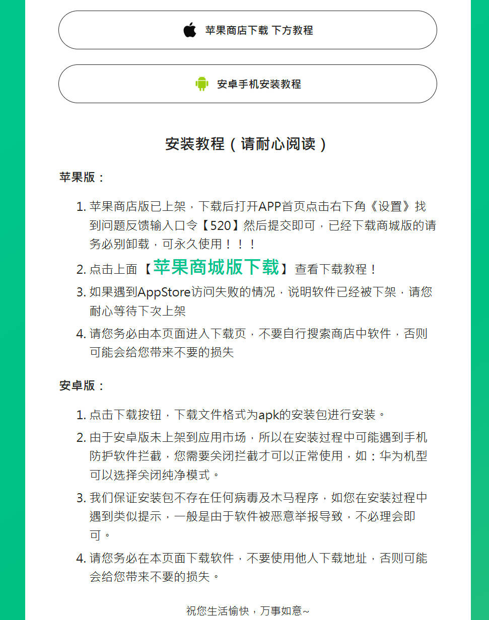 站点描述:苹果版: 苹果商店版已上架,下载后打开APP首页点击右下角《设置》找到问题反馈输入口令【520】然后提交即可,已经下载商城版的请务必别卸载,可永久使用!!! 点击上面 【苹果商城版下载】 查看下载教程! 如果遇到AppStore访问失败的情况,说明软件已经被下架,请您耐心等待下次上架 请您务必由本页面进入下载页,不要自行搜索商店中软件,否则可能会给您带来不要的损失 安卓版: 点击下载按钮,下载文件格式为apk的安装包进行安装。 由于安卓版未上架到应用市场,所以在安装过程中可能遇到手机防护软件拦截,您需要关闭拦截才可以正常使用,如:华为机型可以选择关闭纯净模式。 我们保证安装包不存在任何病毒及木马程序,如您在安装过程中遇到类似提示,一般是由于软件被恶意举报导致,不必理会即可。 请您务必在本页面下载软件,不要使用他人下载地址,否则可能会给您带来不要的损失。