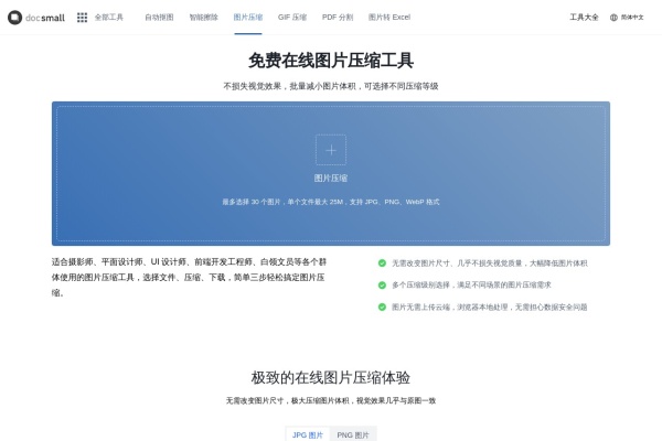 站点描述:docsmall 提供在线图片压缩,在线图片压缩工具,可压缩PNG、JPG格式的图片,不牺牲视觉质量,极大压缩图片体积