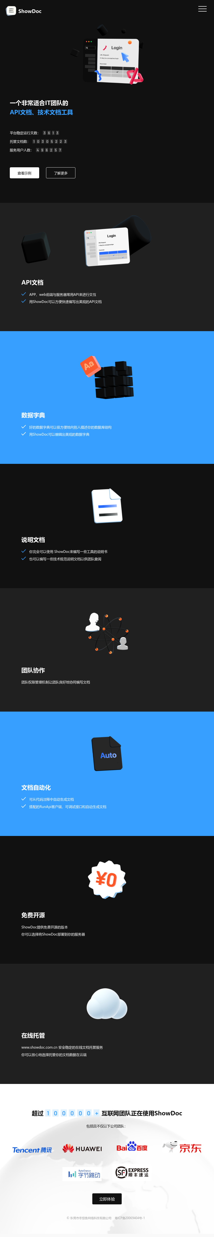 站点描述:一个非常适合IT团队的在线API文档、技术文档工具。你可以使用Showdoc来编写在线API文档、技术文档、数据字典、在线手册