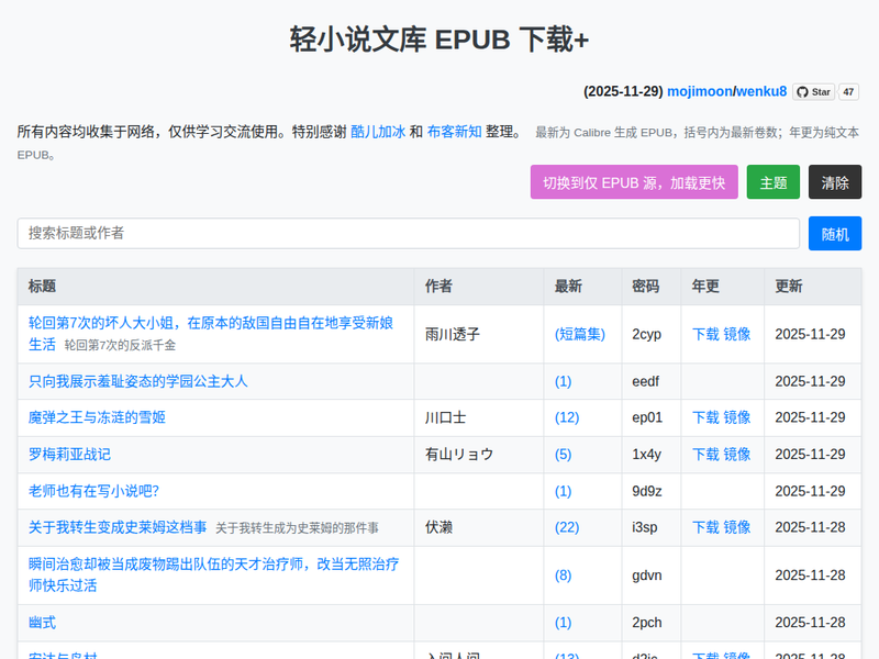 站点描述:轻小说文库 EPUB 下载