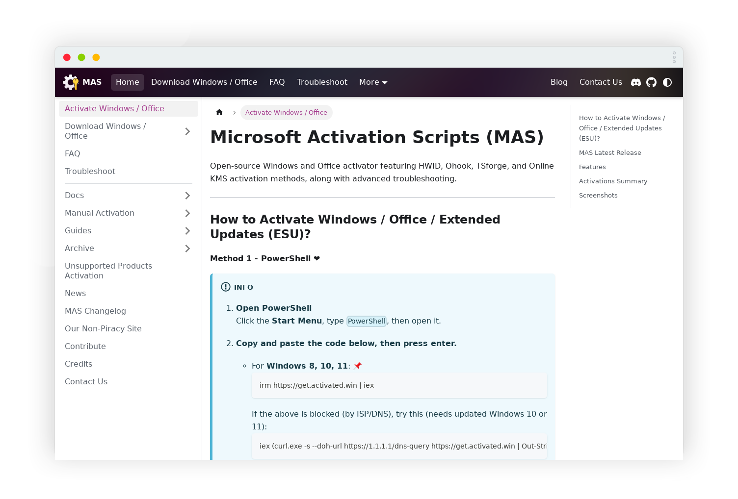 站点描述:Microsoft激活脚本 (MAS) 具有HWID、Ohook、TSforge和在线KMS激活方法以及高级故障排除功能的开源Windows和Office激活器。
