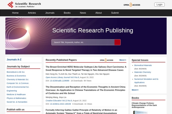 站点描述:Scientific Research Publishing is an academic publisher with more than 200 open access journal in the areas of science, technology and medicine. It also publishes academic books and conference proceedings.