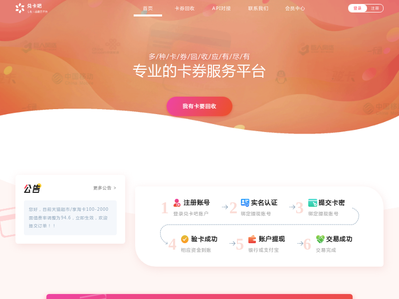 站点描述:兑卡吧专注点卡、充值卡回收,回收类目有电信、联通、移动话费卡回收;石化、石油加油卡回收;网易一卡通、骏网一卡通等游戏点卡回收;京东E卡回收、礼品卡回收、视频卡回收、游戏点卡回收转让寄售等。