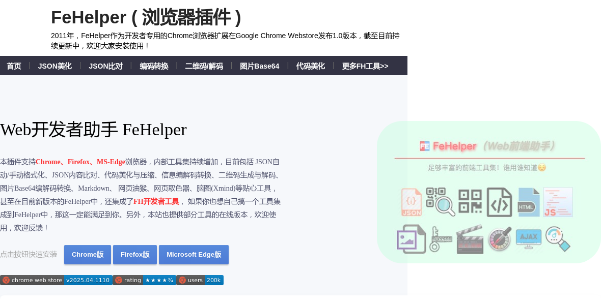 站点关键:FeHelper,WEB前端助手,JSON格式化,JSON对比,信息编解码,代码美化,代码压缩,二维码生成,二维码解码,图片Base64转换,Markdown,随机密码生成器,正则表达式,时间戳转换,便签笔记,进制转换,贷款计算器