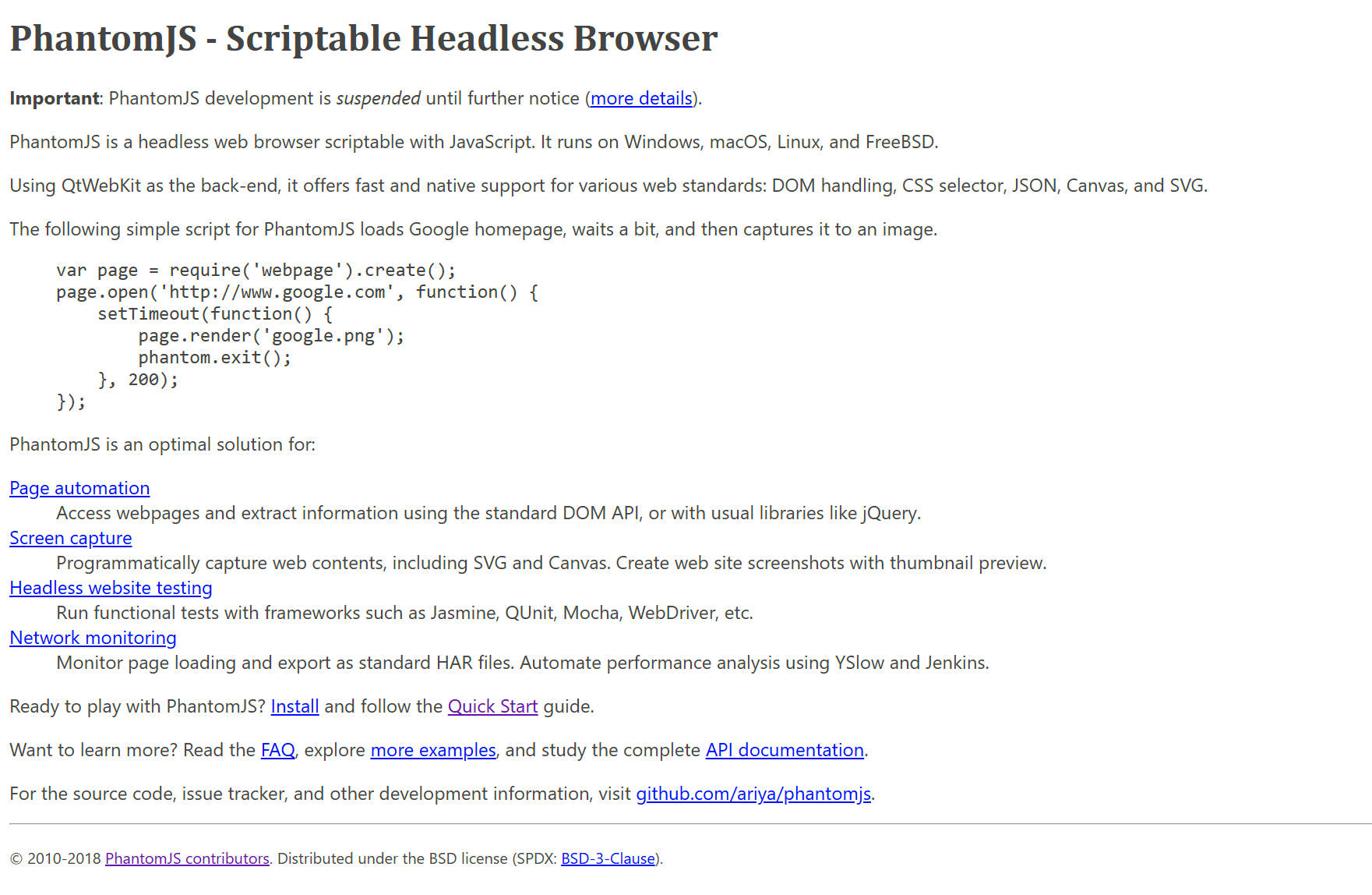 站点描述:PhantomJS - 可编写脚本的无头浏览器 重要提示:PhantomJS 开发暂停,直至另行通知(更多详细信息)。 PhantomJS 是一个无头的网络浏览器,可使用 JavaScript 编写脚本。它可以在 Windows、macOS、Linux 和 FreeBSD 上运行。 它使用 QtWebKit 作为后端,为各种 Web 标准提供快速和原生支持:DOM 处理、CSS 选择器、JSON、Canvas 和 SVG。 以下用于 PhantomJS 的简单脚本加载 Google 主页,稍等片刻,然后将其捕获到图像中。